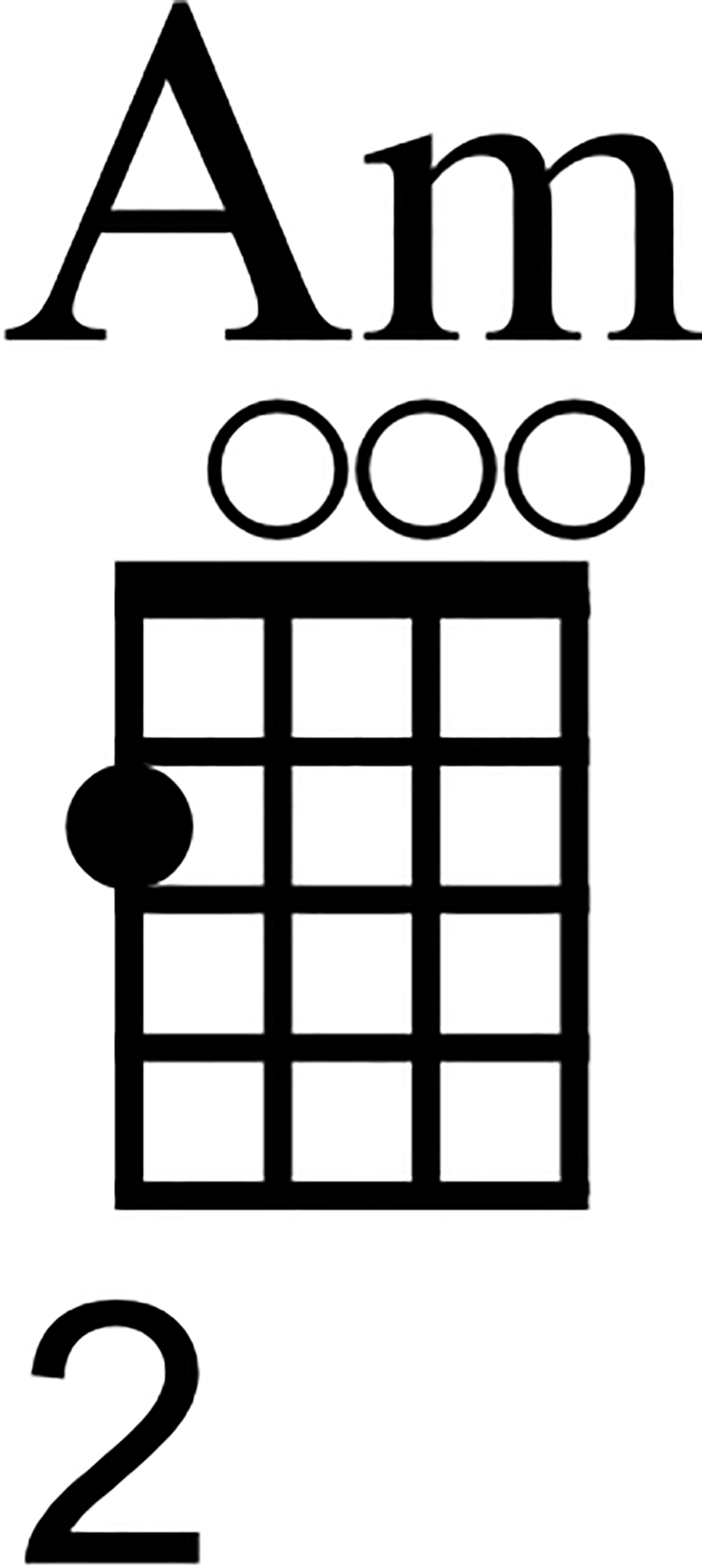 To play an Am chord on ukulele, place your middle finger on the 2nd fret of the top g-string and let the bottom three strings ring open.