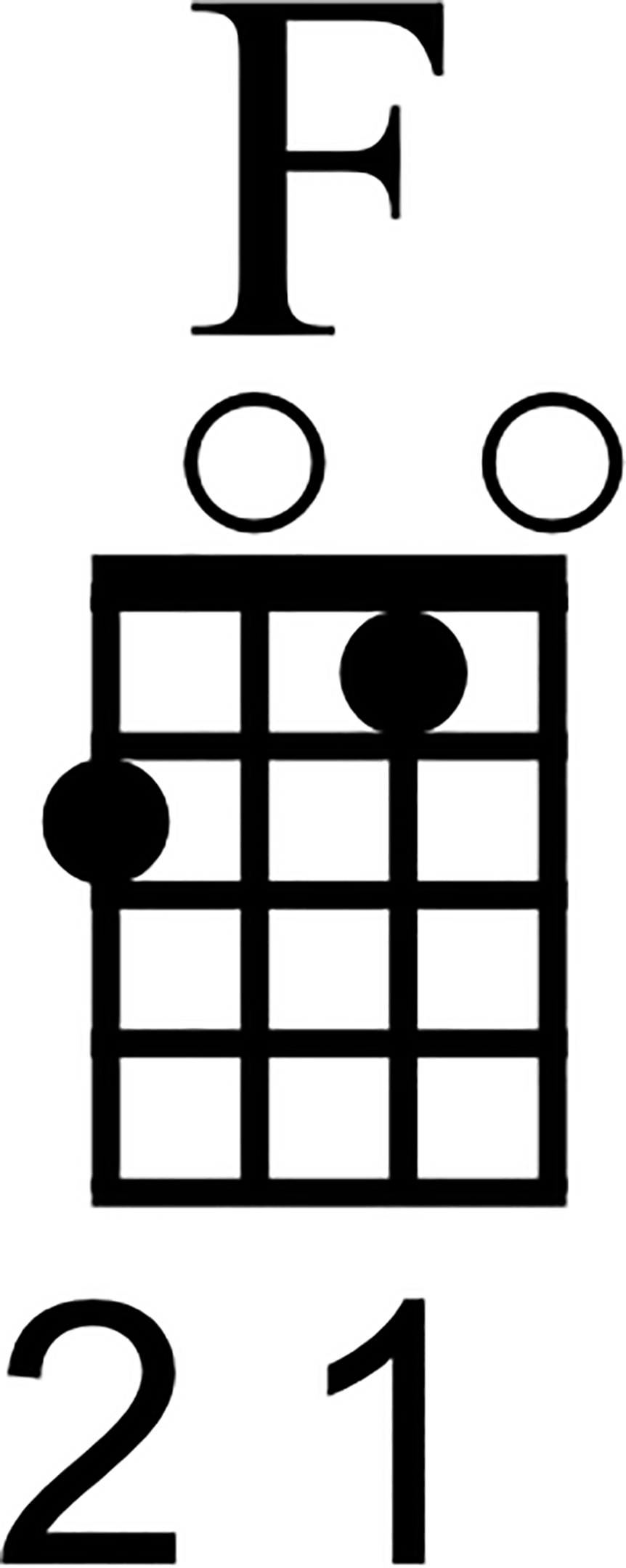 To play an F chord on ukulele, place your middle finger on the 2nd fret of the top g-string, index finger on the 1st fret of the E-string, and let the other two strings ring open.