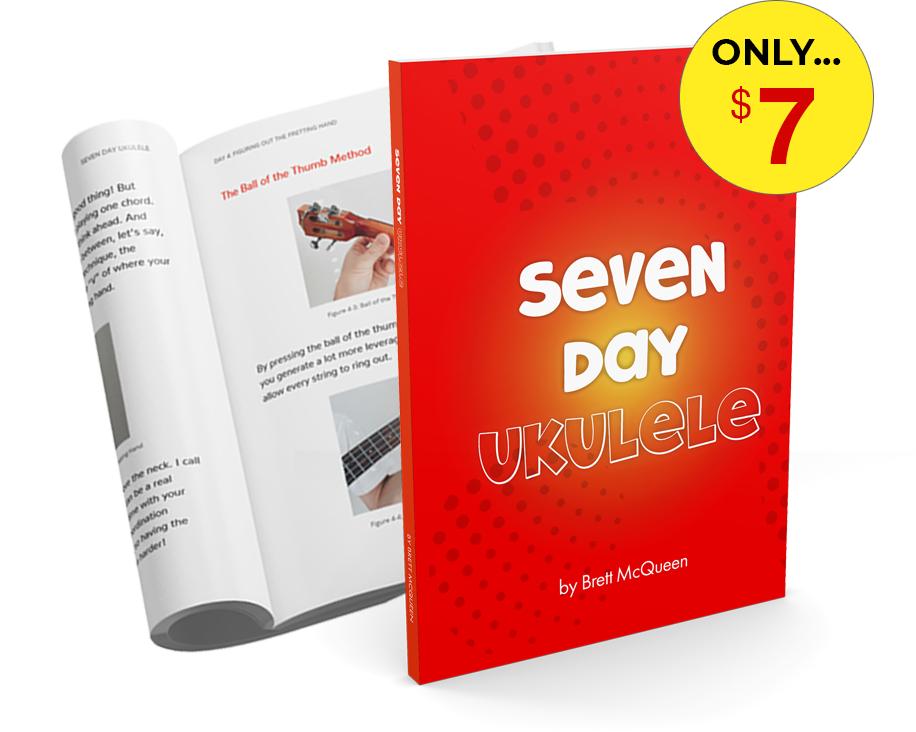 I’ve put all the steps together in an easy-to-follow digital workbook called Seven Day Ukulele. This isn’t a bunch of high-brow music theory mumbo jumbo – this is a practical step-by-step plan to learn chords, learn the strumming, and figure out how to put those two together to play actual songs. It’s the best way to get started with ukulele because it gives you everything you need to start making music today!
